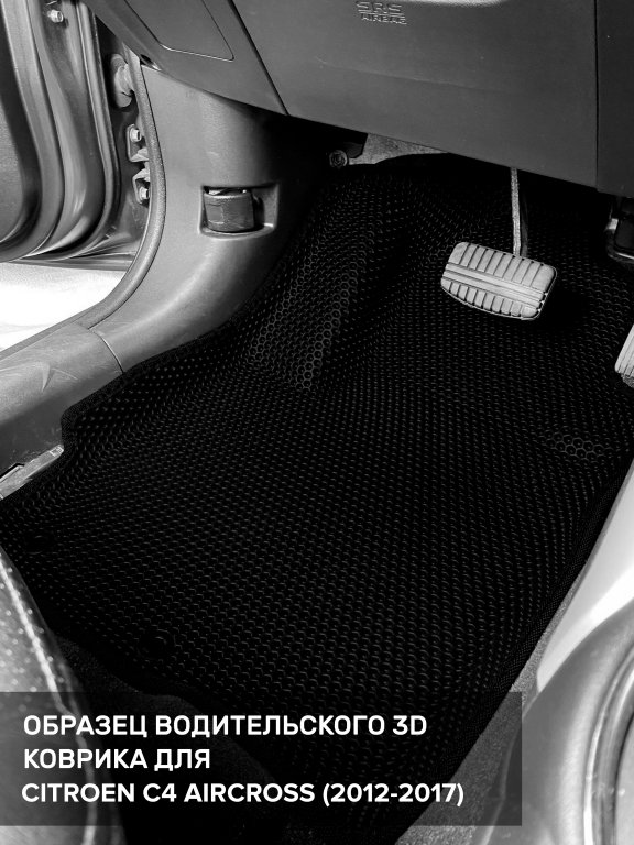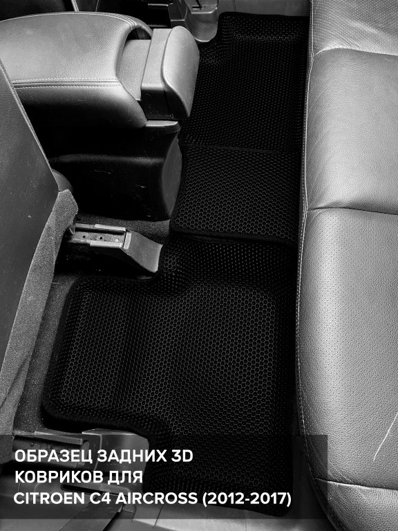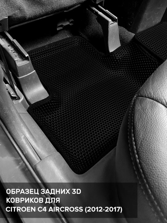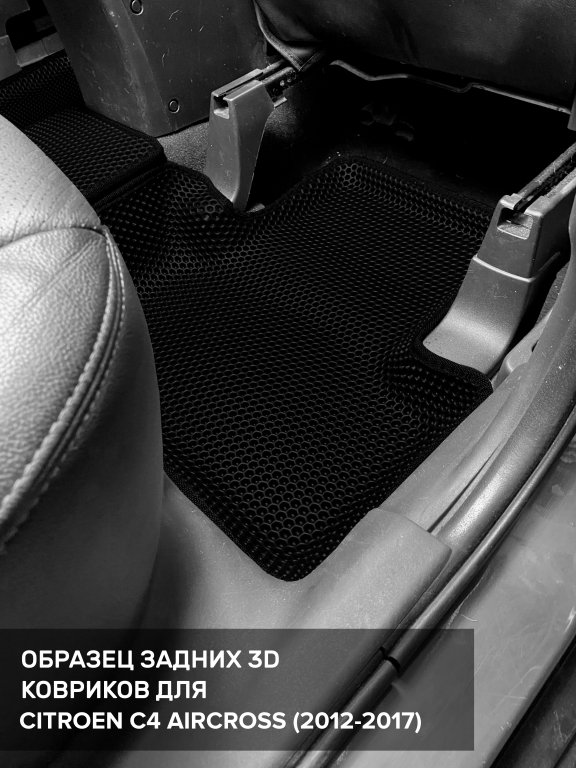 Автомобильные 3д коврики для Citroen C4 Aircross (2012-2017) в салон авто и багажник сделаны из инновационного полимерного материала EVA, изысканная структура в виде ячеек не дает воде, пыли и снегу разлетаться по салону машины и багажнику. 3д коврики зафиксированы на полу определенными клипсами, соответствующими Citroen C4 Aircross (2012-2017), и не двигаются в процессе езды.