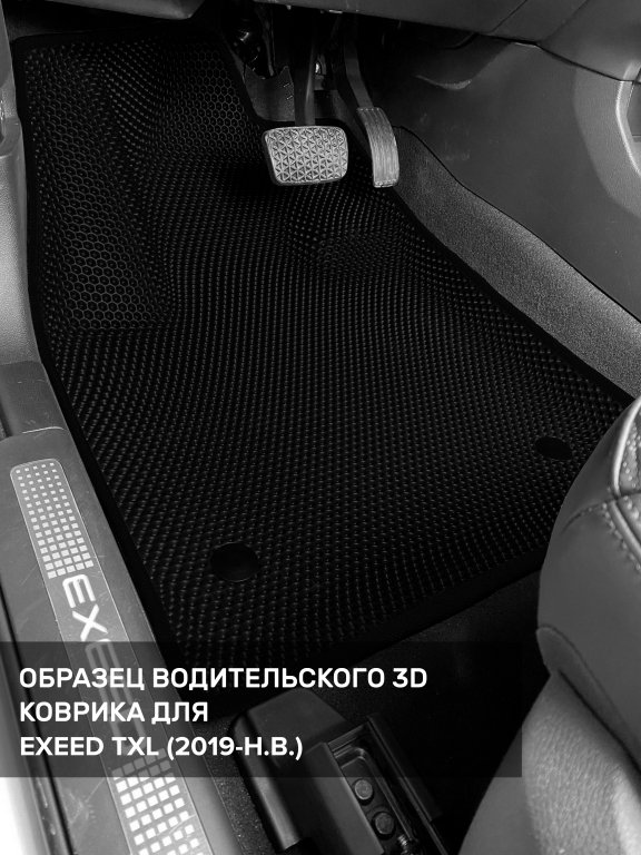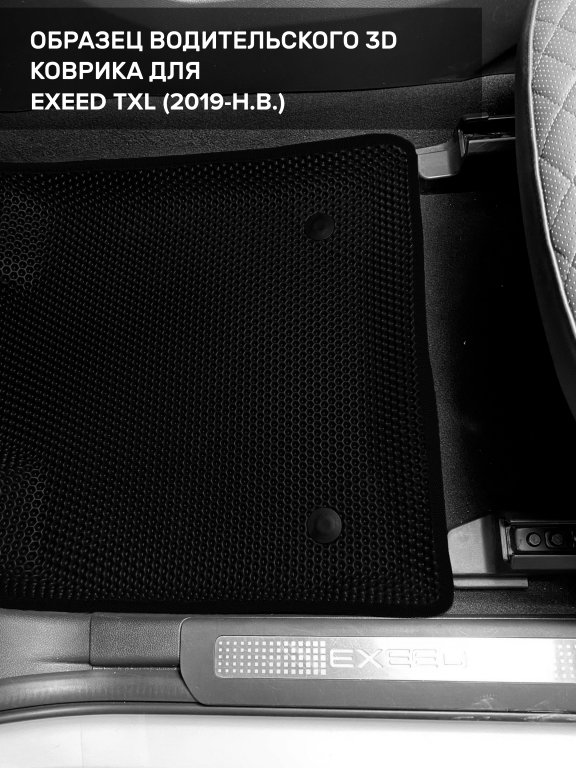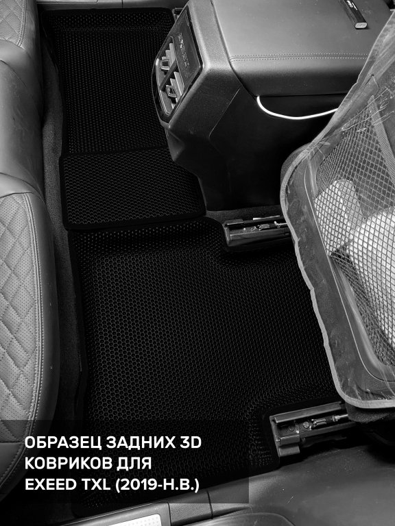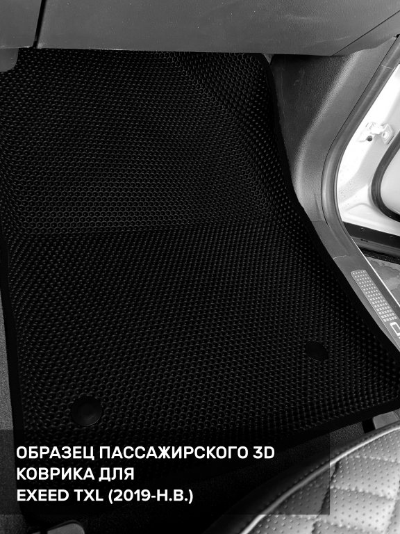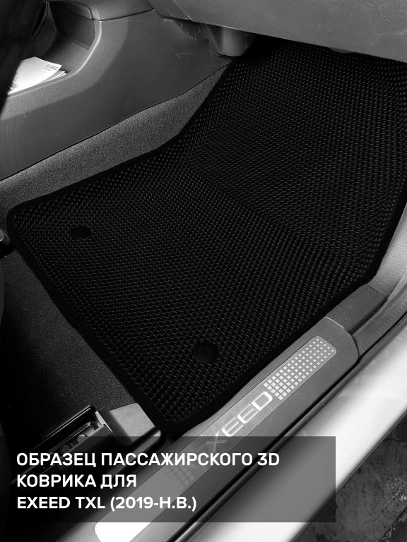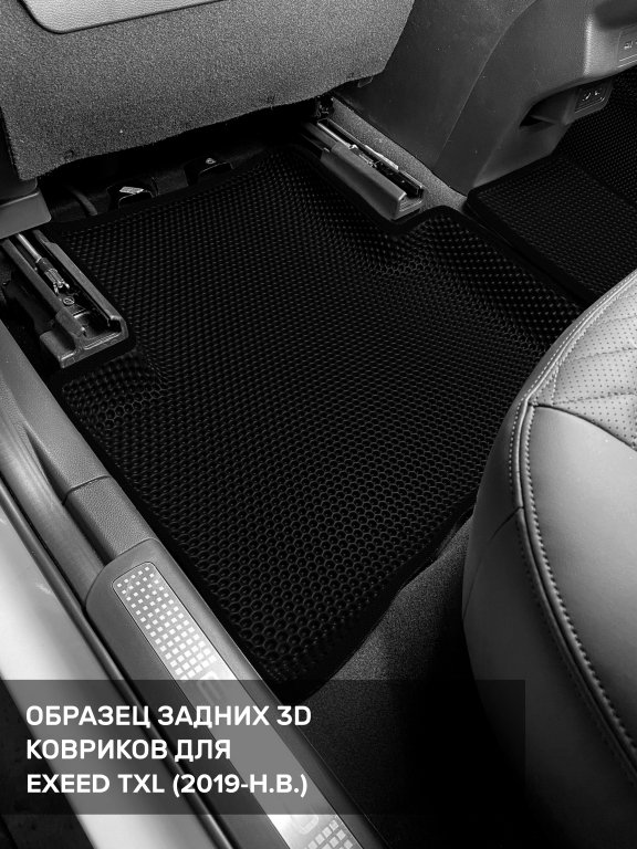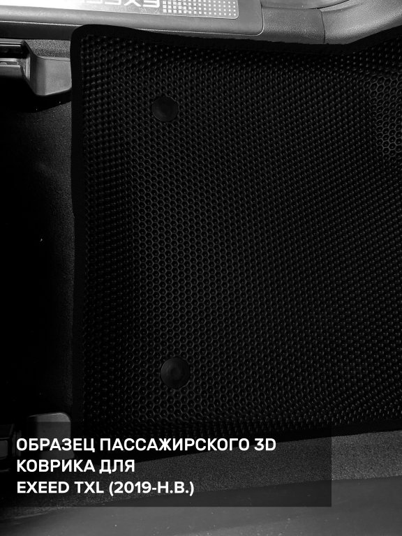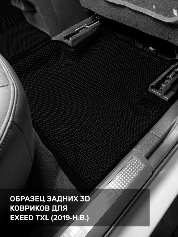 Автомобильные 3д коврики для EXEED TXL (2019-н.в.) в салон авто и багажник сделаны из инновационного полимерного материала EVA, изысканная структура в виде ячеек не дает воде, пыли и снегу разлетаться по салону машины и багажнику. 3д коврики зафиксированы на полу определенными клипсами, соответствующими EXEED TXL (2019-н.в.), и не двигаются в процессе езды.