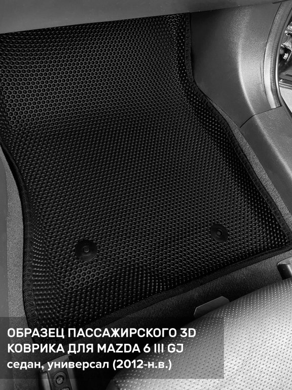 Автомобильные 3д коврики для Mazda 6 III GJ седан, универсал (2012-н.в.) в салон авто и багажник сделаны из инновационного полимерного материала EVA, изысканная структура в виде ячеек не дает воде, пыли и снегу разлетаться по салону машины и багажнику. 3д коврики зафиксированы на полу определенными клипсами, соответствующими Mazda 6 III GJ седан, универсал (2012-н.в.), и не двигаются в процессе езды.