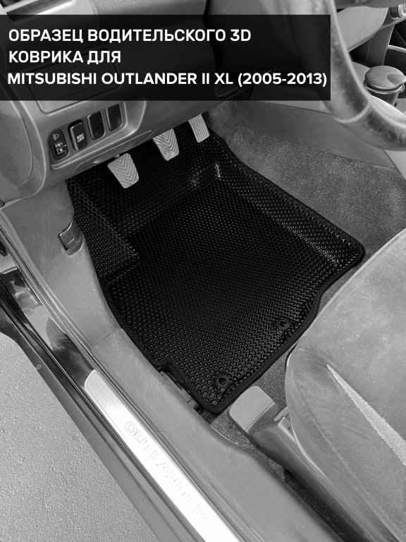 Автомобильные 3д коврики для Mitsubishi Outlander II XL (2005-2013) в салон авто и багажник сделаны из инновационного полимерного материала EVA, изысканная структура в виде ячеек не дает воде, пыли и снегу разлетаться по салону машины и багажнику. 3д коврики зафиксированы на полу определенными клипсами, соответствующими Mitsubishi Outlander II XL (2005-2013), и не двигаются в процессе езды.