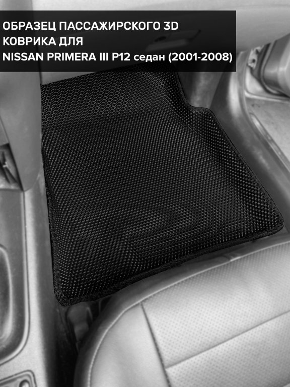 Автомобильные 3д коврики для Nissan Primera III P12 (2001-2008) в салон авто и багажник сделаны из инновационного полимерного материала EVA, изысканная структура в виде ячеек не дает воде, пыли и снегу разлетаться по салону машины и багажнику. 3д коврики зафиксированы на полу определенными клипсами, соответствующими Nissan Primera III P12 (2001-2008), и не двигаются в процессе езды.