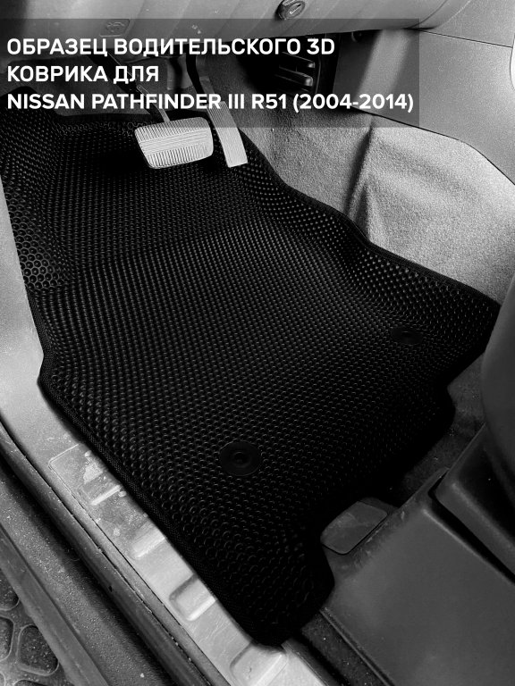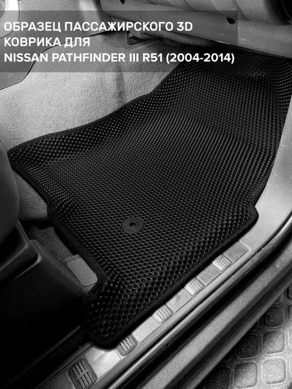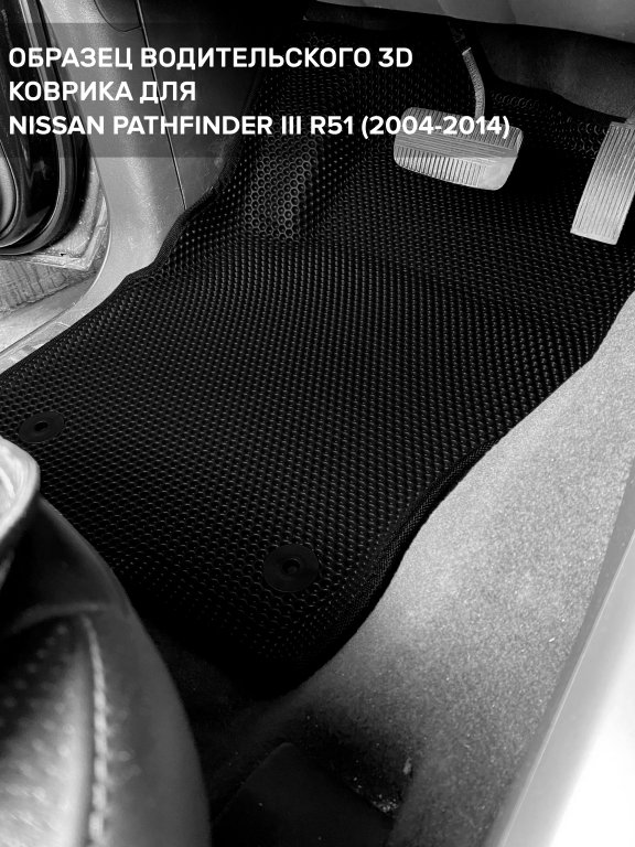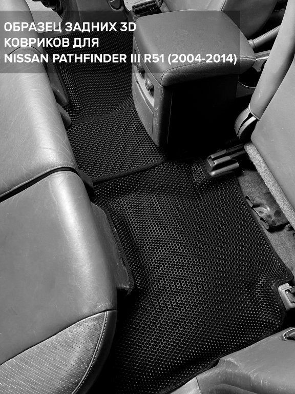 Автомобильные 3д коврики для Nissan Pathfinder III R51 7 мест (2004-2014) в салон авто и багажник сделаны из инновационного полимерного материала EVA, изысканная структура в виде ячеек не дает воде, пыли и снегу разлетаться по салону машины и багажнику. 3д коврики зафиксированы на полу определенными клипсами, соответствующими Nissan Pathfinder III R51 7 мест (2004-2014), и не двигаются в процессе езды.