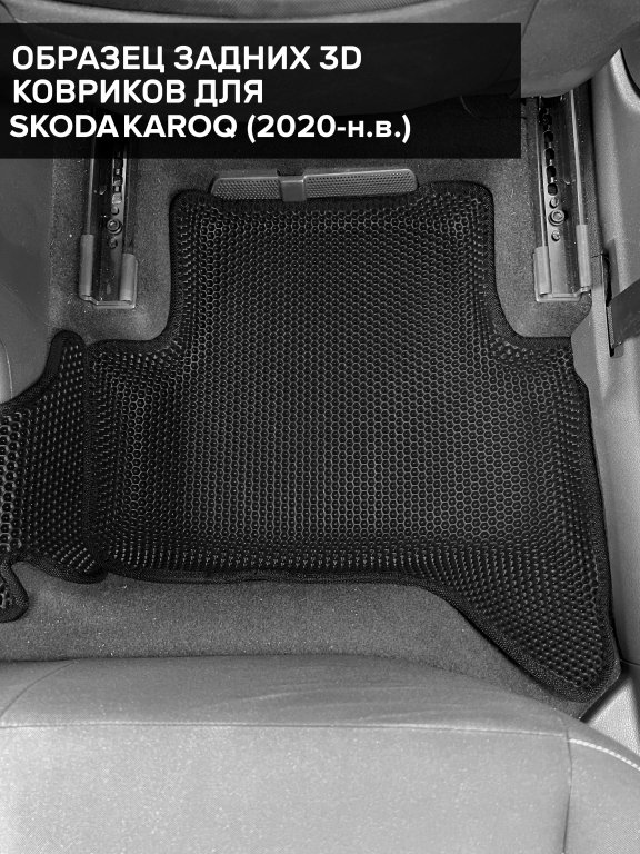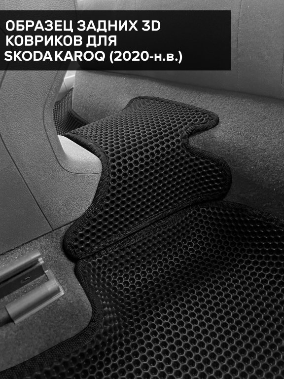 Автомобильные 3д коврики для Skoda Karoq (2020-н.в.) в салон авто и багажник сделаны из инновационного полимерного материала EVA, изысканная структура в виде ячеек не дает воде, пыли и снегу разлетаться по салону машины и багажнику. 3д коврики зафиксированы на полу определенными клипсами, соответствующими Skoda Karoq (2020-н.в.), и не двигаются в процессе езды.