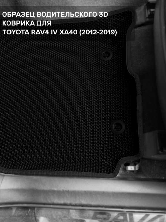 Автомобильные 3д коврики для Toyota RAV4 IV XA40 (2012-2019) в салон авто и багажник сделаны из инновационного полимерного материала EVA, изысканная структура в виде ячеек не дает воде, пыли и снегу разлетаться по салону машины и багажнику. 3д коврики зафиксированы на полу определенными клипсами, соответствующими Toyota RAV4 IV XA40 (2012-2019), и не двигаются в процессе езды.